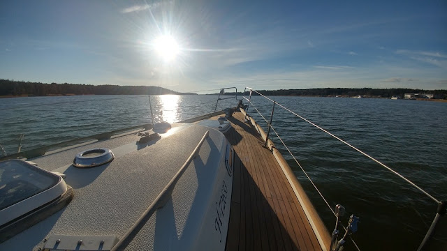 This year Dolphin Dance was launched over a month earlier than normally. A fairly large renovation project was undertaken during the spring, as the teak deck was maintained and sanded, the blue stripes were repainted and the topsides were polished. The work was finished just in time for the launch, as the spring is early this year and our home bay was already free of ice in the beginning of April.