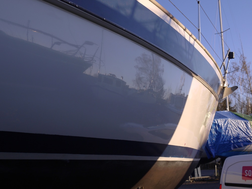 The topsides were polished and waxed with Autoglym’s products, of which we had good experiences from last season. Prior to the polishing, the hull was washed with boat shampoo and the topsides were treated with oxalic acid based Gelcoat Cleaning Powder (Hempel) to get rid of the yellow waterline stain.