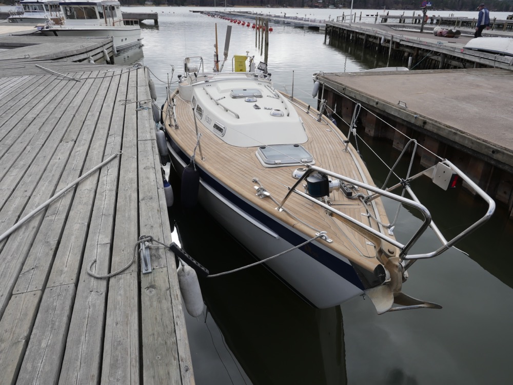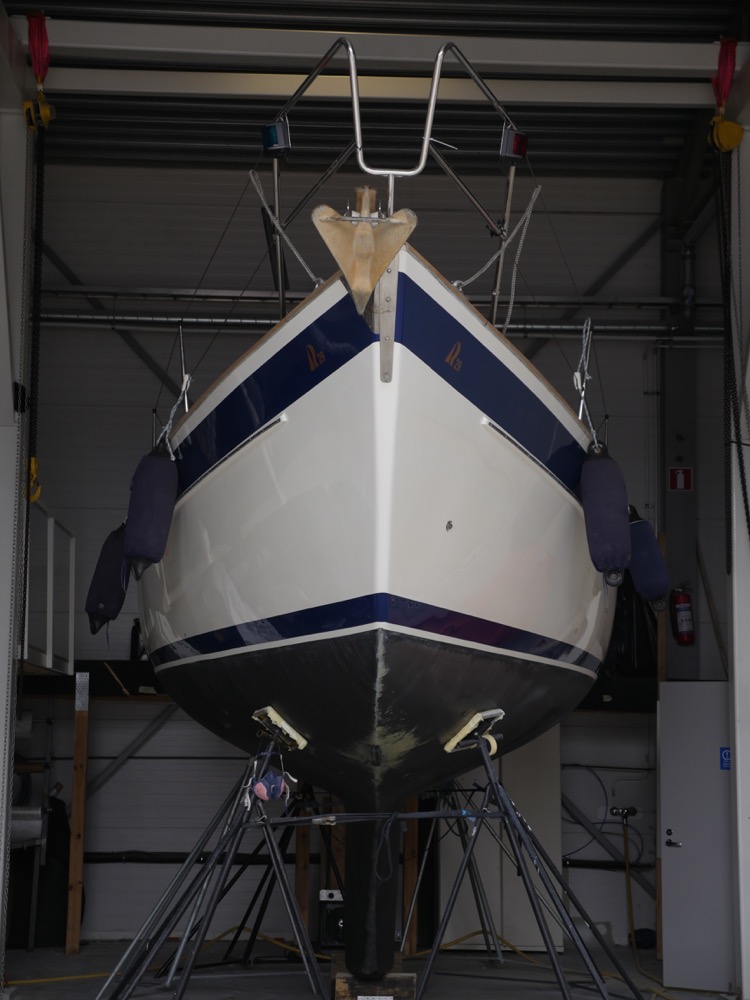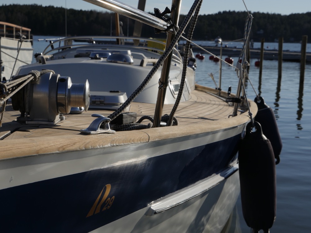 This year Dolphin Dance was launched over a month earlier than normally. A fairly large renovation project was undertaken during the spring, as the teak deck was maintained and sanded, the blue stripes were repainted and the topsides were polished. The work was finished just in time for the launch, as the spring is early this year and our home bay was already free of ice in the beginning of April.