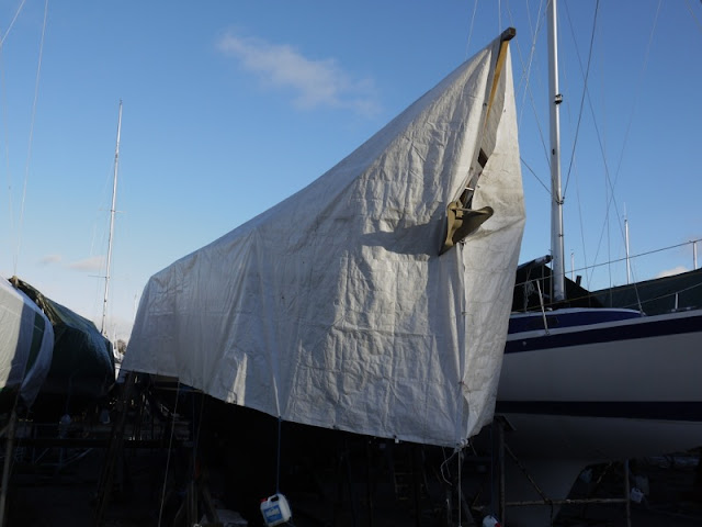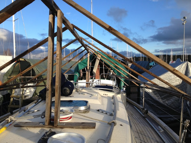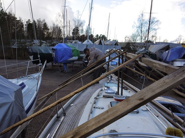 DD’s winter cover frame is definitely not an architectural masterpiece – compared to some of the ‘boat houses’ in the yard – but it has served its job pretty well during the two winters (2010/2011 & 2011/2012) and also through the Dagmar storm in 2011. On the other hand, our berth at the boat yard is pretty sheltered, so more windy location might need sturdier winter cover frame. For this year, we made some improvements by adding support planks from the ground to the deck frame, which makes it easier to tie the plastic tarpaulin and keeps the tarpaulin away from the topsides. This improves ventilation and also keeps the topsides cleaner.