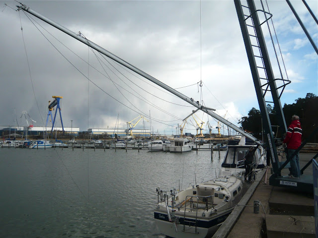 The mast was raised on Sunday 1st of May. There was a problem with the length of the shrouds. The reason for this was that the old Hasselfors rigging screws were changed to Selden‘s Bronze screws, which are slightly longer. To compensate this the shrouds were shortened, but apparently too much. So toggle was needed between each shroud and rigging screw. We couldn’t buy them but next morning since the shops were closed. So the boat was left under the mast crane and we finished the rigging on Monday.