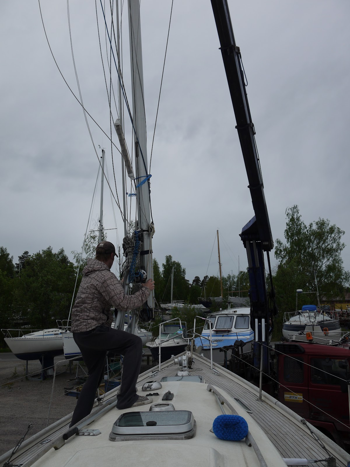 Stepping the mast took about 15-20 minutes with a crane truck. The operation was much easier and less stressful compared to using a mast crane at the harbour.