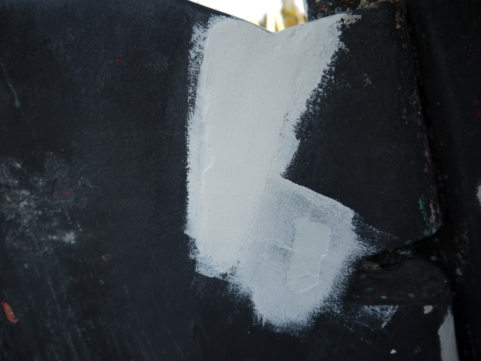 Hienosti kiiltää Charlottan peräsin! Meillä ei lopputulos näyttänyt valitettavasti ihan yhtä hyvältä. Tuo peräsin on ensi talven pohjarempan yhteydessä tarkoitus putsata vanhoista maaleista ja primereista, joten en viitsinyt täksi kaudeksi tehdää enempää kuin välttämättömät korjaukset.
