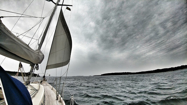 We sailed across the Åland Sea from Mariehamn to Stockholm Archipelago on Wednesday the 28th of June. The wind conditions were almost perfect: the northwesterly wind had eased to about 14 to 16 knots, so we were able to sail most of the leg at good speed. The wind only eased in the late afternoon when we were already close to the destination.