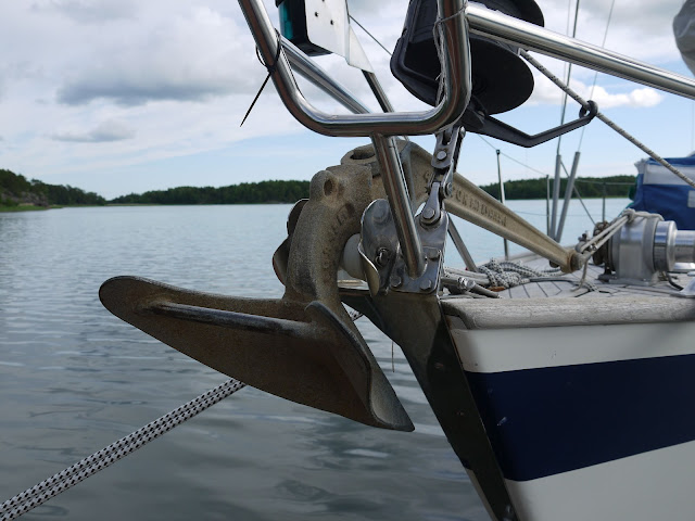 By the way, as you can see in our last photo, we are back at using our old CQR-anchor. It turned out that the roll-bar in smaller 10 kg Delta anchor was placed higher, when stored in the bow, than in the CQR. Also the roll-bar was smaller, and therefore getting on board from the bow was a bit too difficult. We also tried to find bow ladders, that would work with Delta, but could not find suitable ones from local maritime stores. Thus, we decided to return the Delta and continue with the CQR after all…