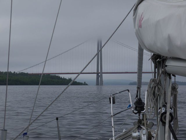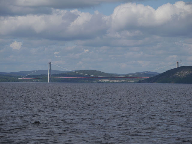 On Saturday, when the rain stopped, we started exploring the High Coast area. There was not that much wind so we were motoring. First, we went to see the Höga Kusten Bridge which is the third longest suspension bridge in Europe. The maximum height is 40 meters and the pillars are about 180 meters high.  We also checked out the marina close by called Hornö Brygga, but decided to continue further.