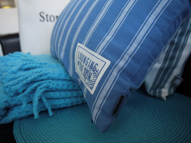 First of all, we bought this one storage box that shall be a new home for clothes so that we need not have that many bags onboard. Additionally, I finally chose to buy the striped pillow by Gant (that was listed as the first one earlier) and one additional blue striped pillow by Casa Stockmann. The turquoise blanket is also by Casa Stockmann, as are the blue and white striped napkins.