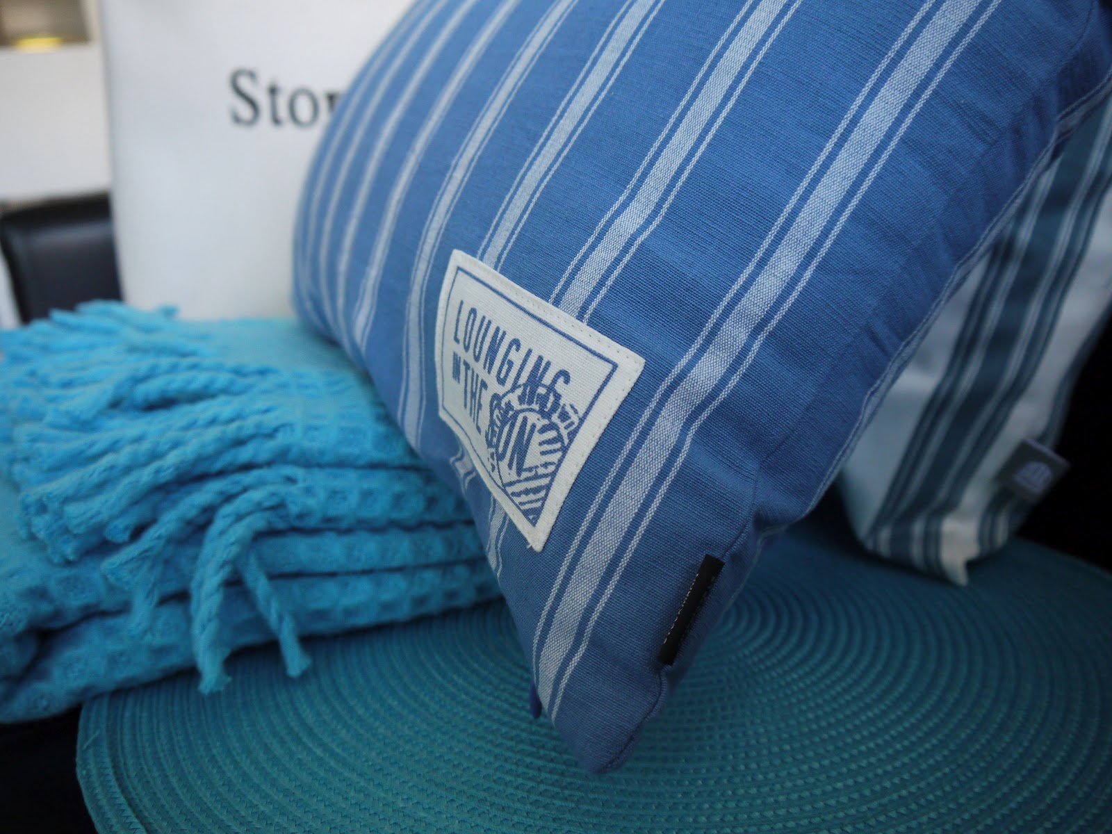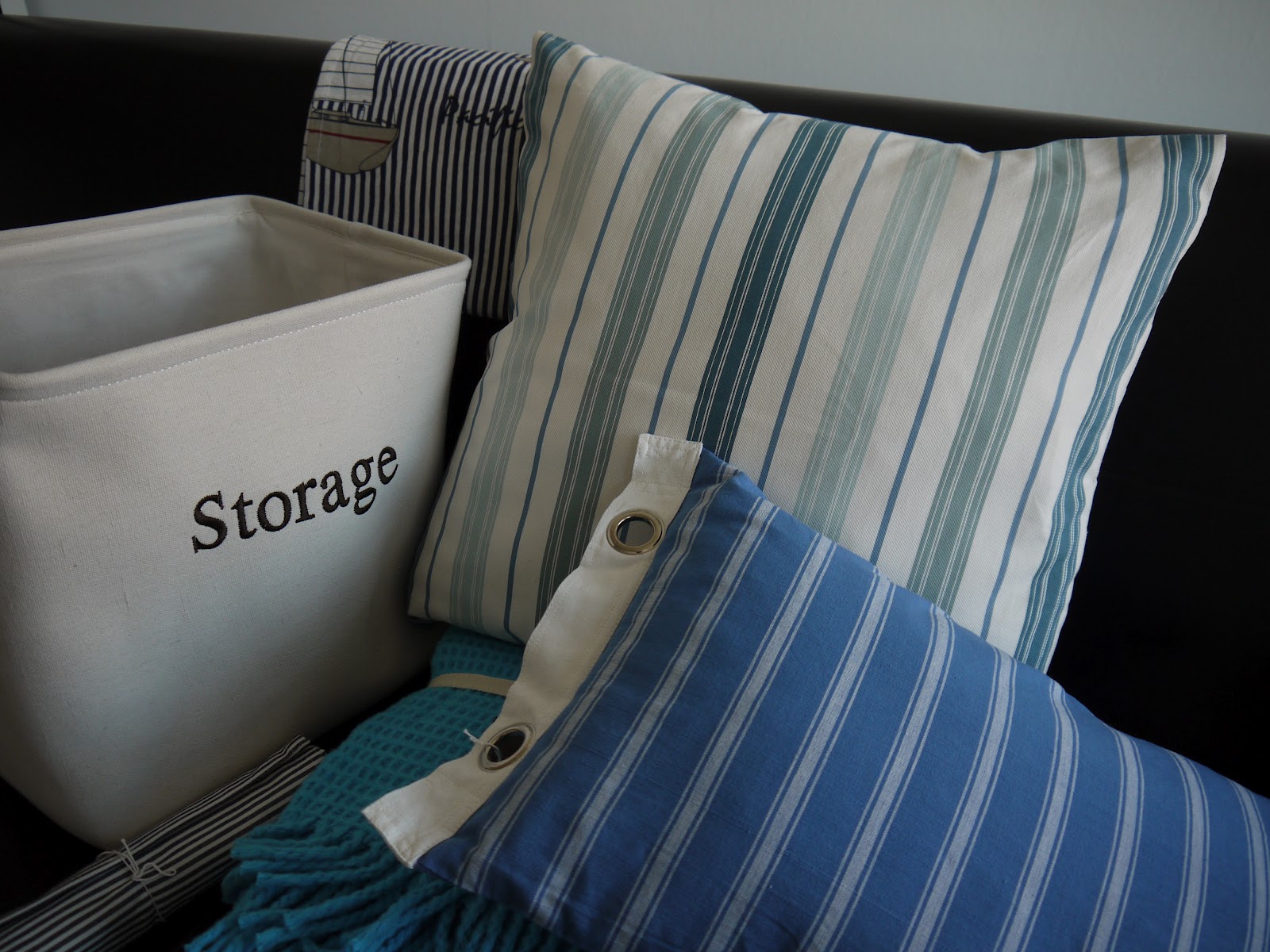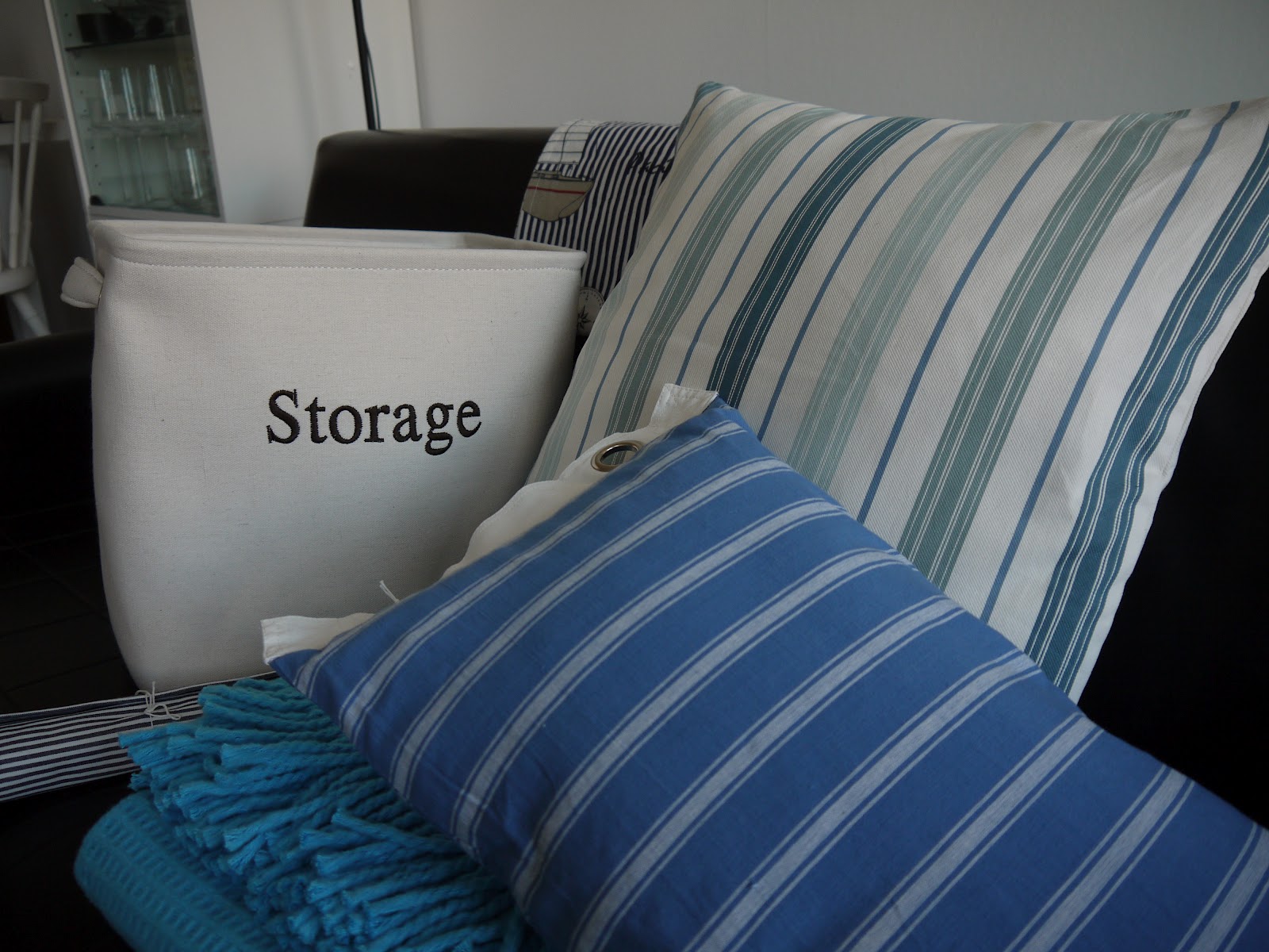 First of all, we bought this one storage box that shall be a new home for clothes so that we need not have that many bags onboard. Additionally, I finally chose to buy the striped pillow by Gant (that was listed as the first one earlier) and one additional blue striped pillow by Casa Stockmann. The turquoise blanket is also by Casa Stockmann, as are the blue and white striped napkins.