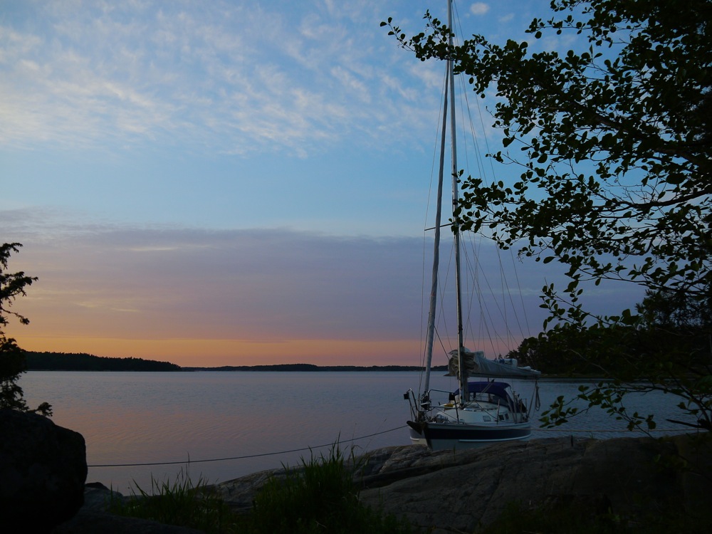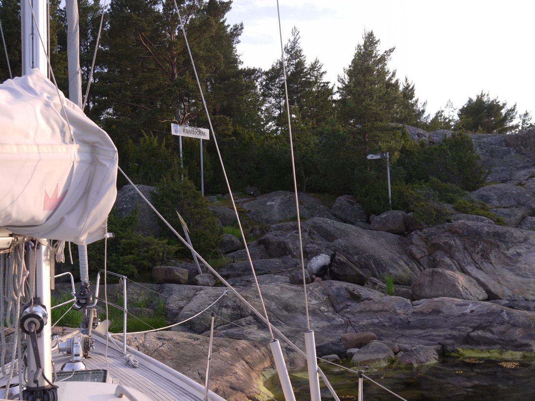 We started on Saturday evening from Airisto Marina, where I had sailed the boat on Thursday. As it was getting late, we looked for sheltered anchorages from the Harbour Book by the Sea Scouts and found an island called Kuuskari, which should be sheltered from the southwesterly winds. Thus, we decided to head there for the night which was a good choice: the rocky shores are deep, the bay on this beautiful anchorage was mirror calm and the anchor seemed to grip well. We do not yet have the inflatable dinghy onboard so we decided to drop the stern anchor and tie the bow on the rings, which we found from the rocks.
