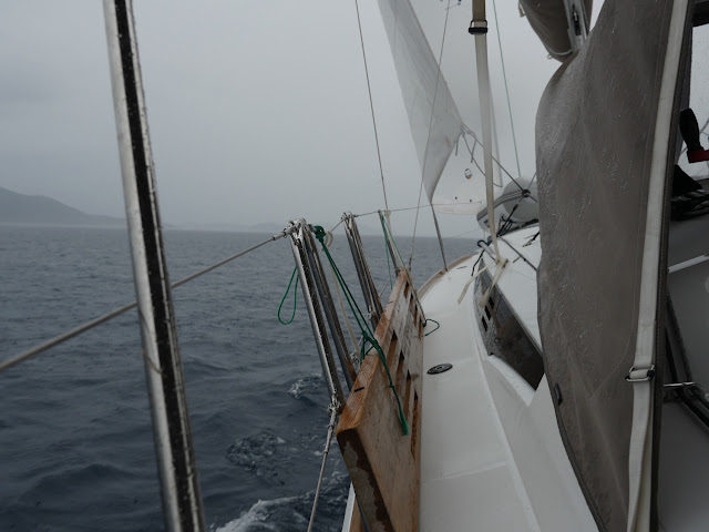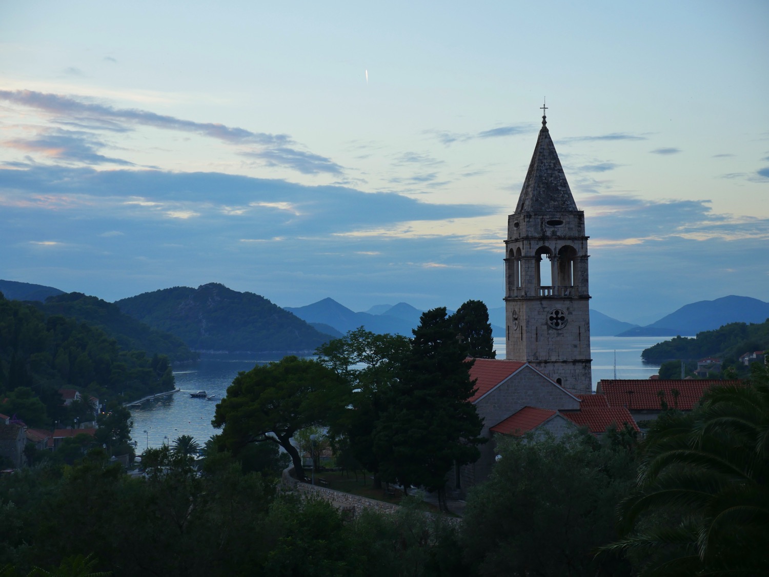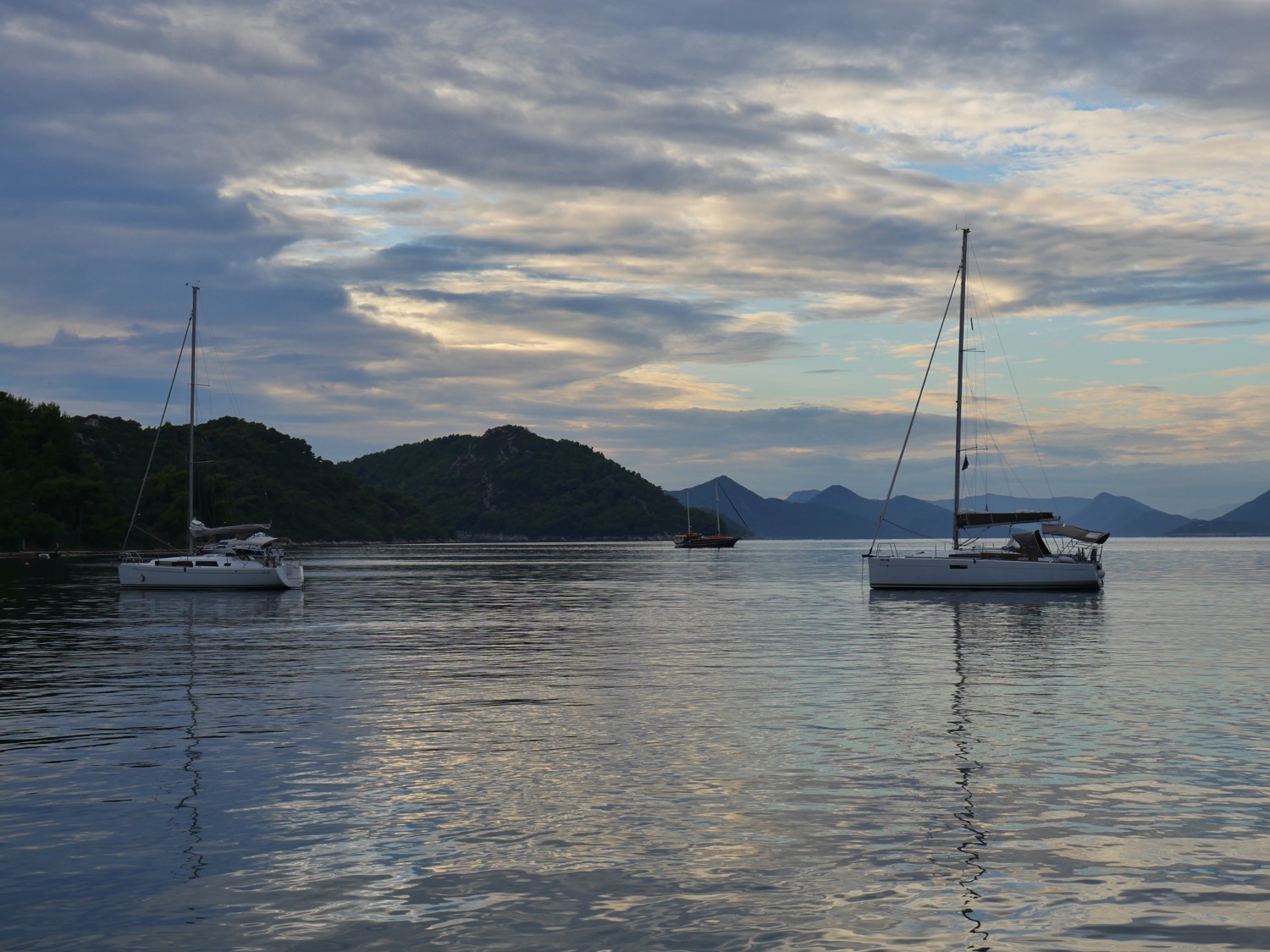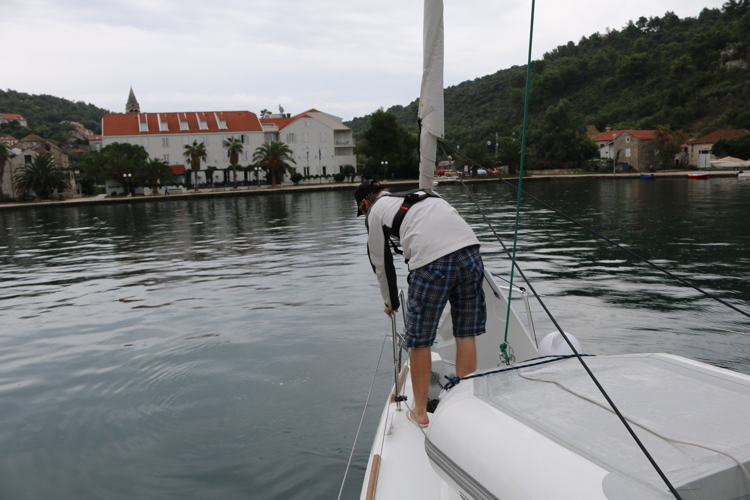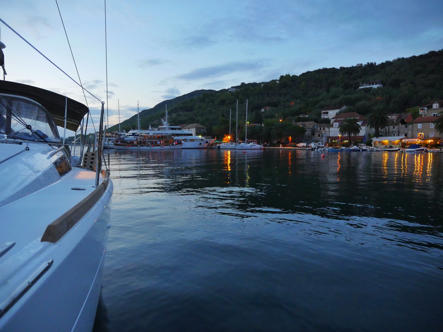 This year we were not as lucky with the weather as last year: the weather forecast for the week was actually pretty bad with lots of rain and thunder forecasted. Unfortunately, the weather forecast seemed to be truthful as well as just after an hour from leaving Dubrovnik, we found ourselves in the middle of thunderstorm. We were sailing at this time, but decided to lower the sails and continue with the engine. We headed for the nearby island called Sipan and found a very sheltered anchorage outside the village Sipanska Luka. The rain stopped in the afternoon and the evening was actually very beautiful.