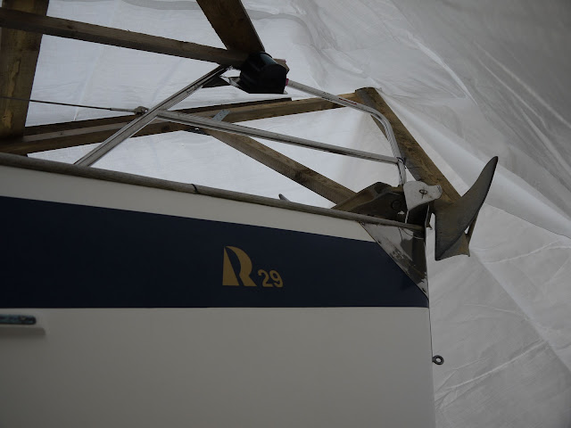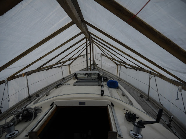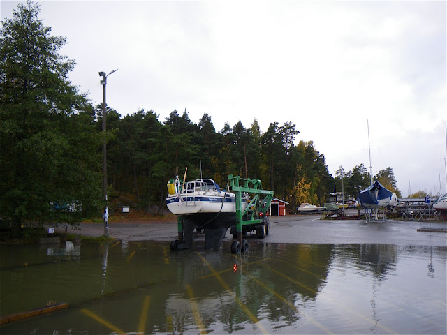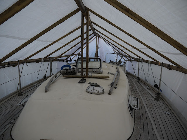 Season is finally over and S/Y Dolphin Dance is now prepared for winter. After lifting the boat up we have been busy cleaning the boat and building the winter cover. We had to leave the front of the keel unsupported so that the scratch in the keel can be properly fixed. Therefore Dolphin Dance is leaning little bit forwards and the water will not exit the deck via drains as designed. Thus we tried to cover the boat well to keep the deck dry during winter.