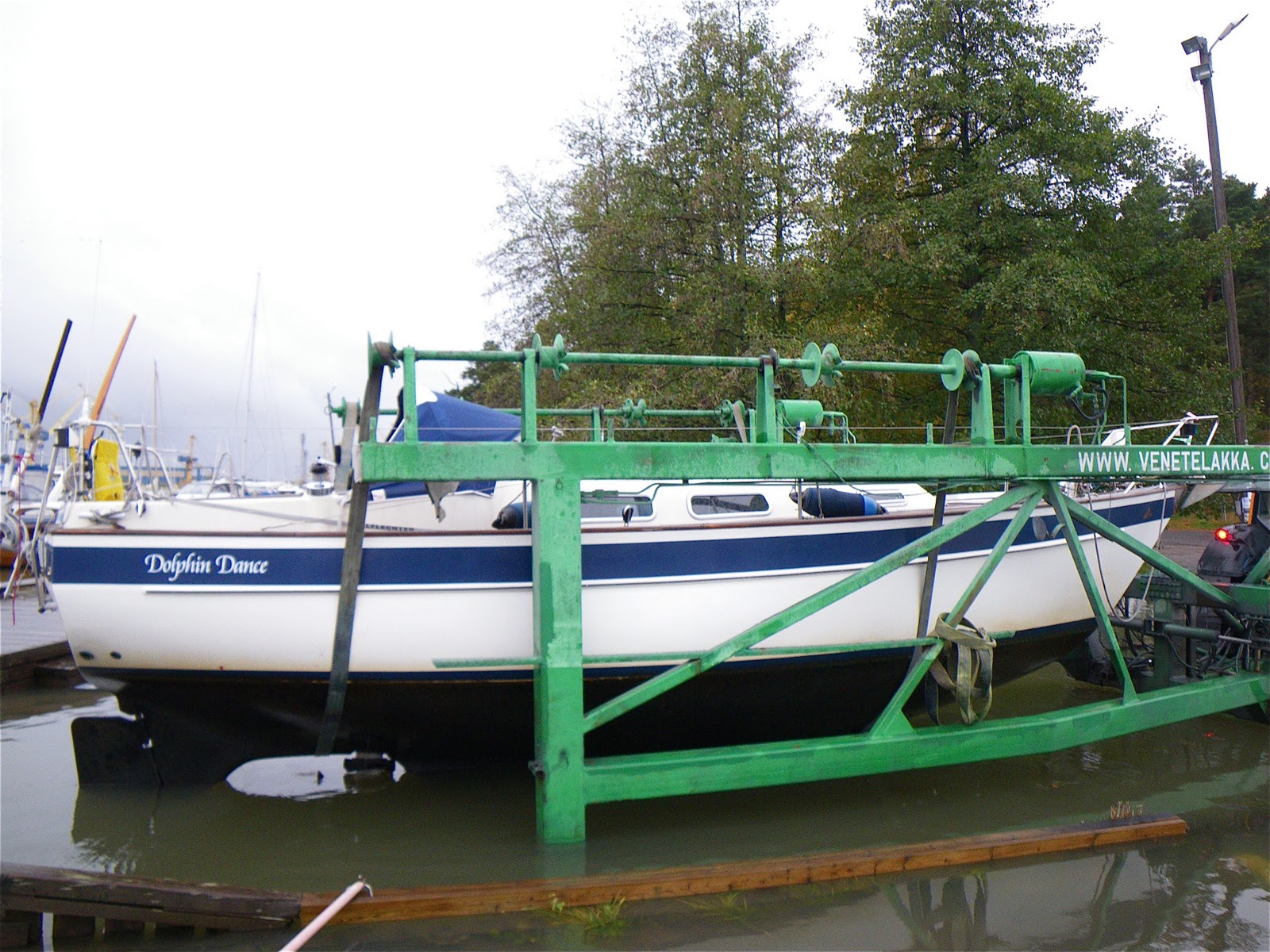 Season is finally over and S/Y Dolphin Dance is now prepared for winter. After lifting the boat up we have been busy cleaning the boat and building the winter cover. We had to leave the front of the keel unsupported so that the scratch in the keel can be properly fixed. Therefore Dolphin Dance is leaning little bit forwards and the water will not exit the deck via drains as designed. Thus we tried to cover the boat well to keep the deck dry during winter.