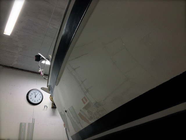 During the last few days we have been busy in getting everything ready for the launch, which is taking place on Thursday. The underwater hull is now coated with five layers of Teknos Inerta 5 epoxy primer and two layers of Hempel Hard Racing (black) antifouling. Also the antifouling waterline was rised about two centimeters as the white stripe near the waterline was coated with white Hard Racing.