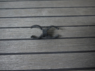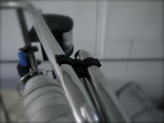 However, it is important that the ladders can be lowered from the water so that one can climb back on board without outside assistance if necessary. Answer to the problem of dropping ladders is a simple flexible double clip. We could not find this kind of clip from the local maritime store, so we bought two single clips, designed for storing boat hooks etc. onboard, and attached (screwed) them together.