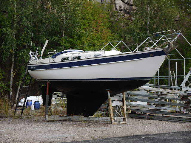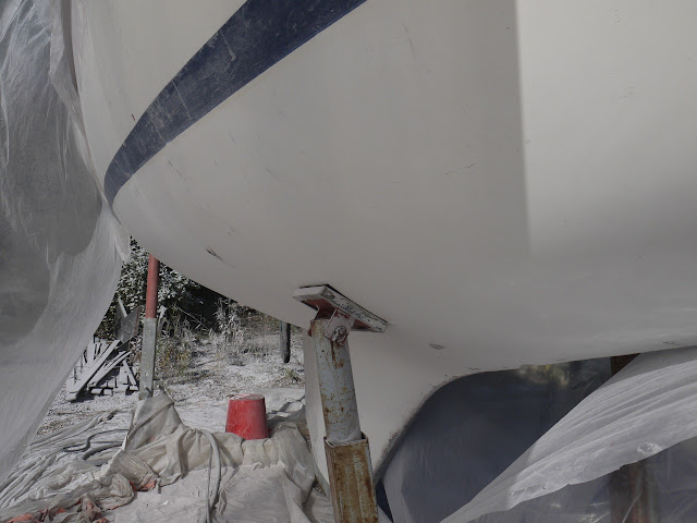 We decided to have the underwater hull blasted right after Dolphin Dance was hoisted out of the water. New barrier coat and antifouling will be applied in the spring. For removing the old bottom paint, we opted soda blasting, which I consider the most advanced and environmentally friendly hull cleaning method. It is gentle for the gelcoat surface compared to sandblasting where a lot of gelcoat is potentially lost. In soda blasting, basically a normal baking (or cooking) soda is sprayed against surface using compressed air. Soda is a natural and water-soluble product, so the residues can be rinsed with water.