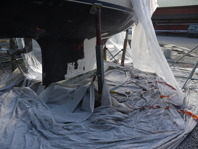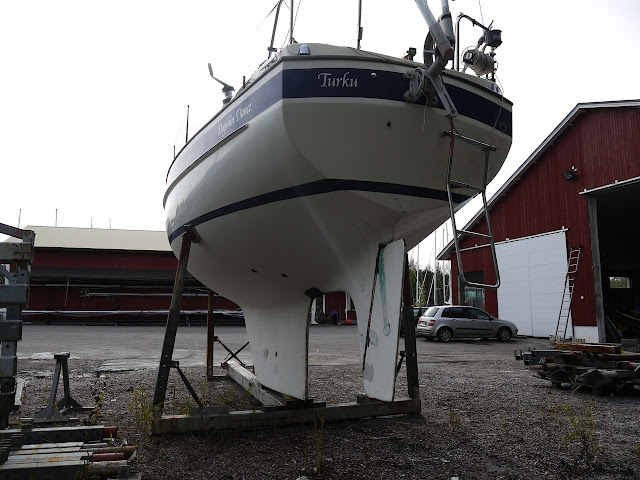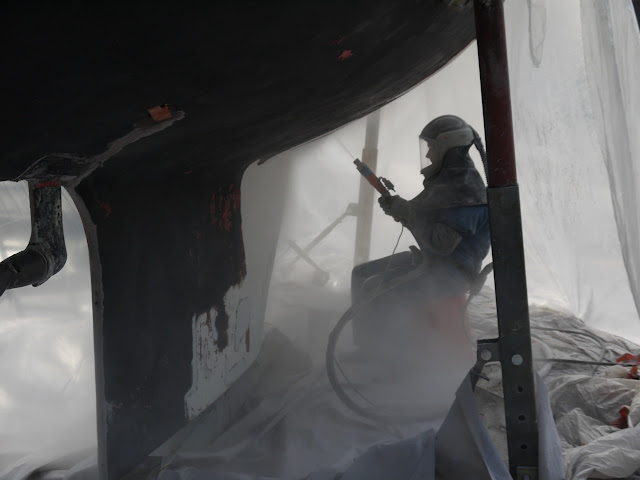 Our renovation project got a kick start on weekend, as the underwater hull and keel were soda blasted clean of old epoxy barrier coat and multiple layers of old antifouling. The work was done by Samuli and Toni from the company Waterproof Solutions Oy.