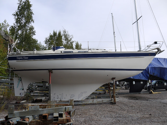 We decided to have the underwater hull blasted right after Dolphin Dance was hoisted out of the water. New barrier coat and antifouling will be applied in the spring. For removing the old bottom paint, we opted soda blasting, which I consider the most advanced and environmentally friendly hull cleaning method. It is gentle for the gelcoat surface compared to sandblasting where a lot of gelcoat is potentially lost. In soda blasting, basically a normal baking (or cooking) soda is sprayed against surface using compressed air. Soda is a natural and water-soluble product, so the residues can be rinsed with water.
