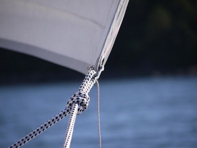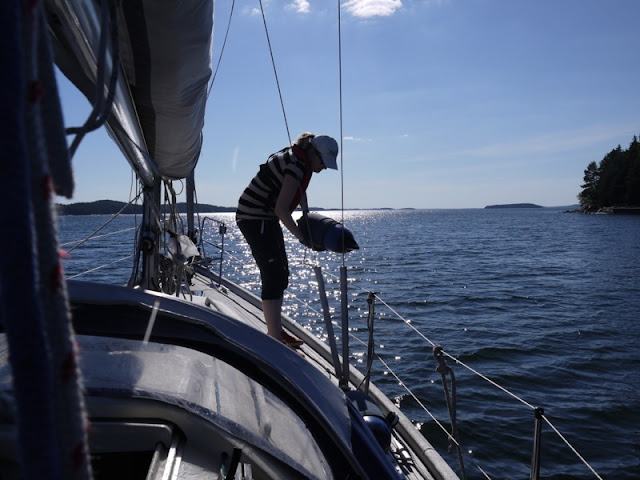 Usually, when collecting the boat stuff from various places after the winter, something essential is missing on the first trip. This time the genoa sheets were not where they should have been: that is the genoa sail bag. Also we could not fit the longest mainsail batten in our car and as the fresh wind was scheduled for the whole weekend, we decided to leave the mainsail stored on the boom and sail only with the genoa this weekend. Temporary genoa sheets were made of our second anchor rope.