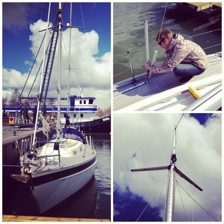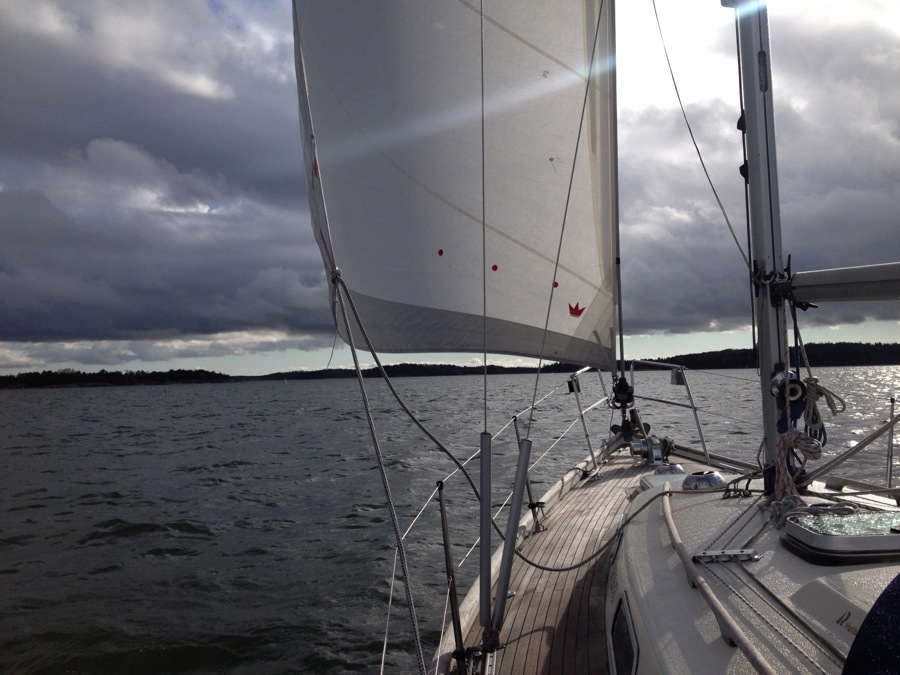 Sunday wasn’t much better in terms of weather as it was cold and raining most of the day. However, the sky cleared for the evening and we had a nice but chilly evening sail. When installing the sails, we discovered (or actually remembered from the Autumn) that the main sail’s stack pack was a bit torn and needed some repairs. It is interesting that there has been over six months to take care of the bloody thing, but it is in the beginning of the season that things like this happen to cross your mind. Thus, we decided to leave the main sail in its sack, and sail with the genoa only.