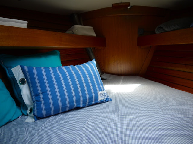 I blogged last spring about our plans of renewing the mattresses for this year. However, I just realized that we have not yet posted any images of the outcome. So here they are, a couple of photos of Dolphin Dance’s new light coloured mattresses, which to be exact, are not that new anymore, since they were delivered in the spring, just in time for the first sail of the season.