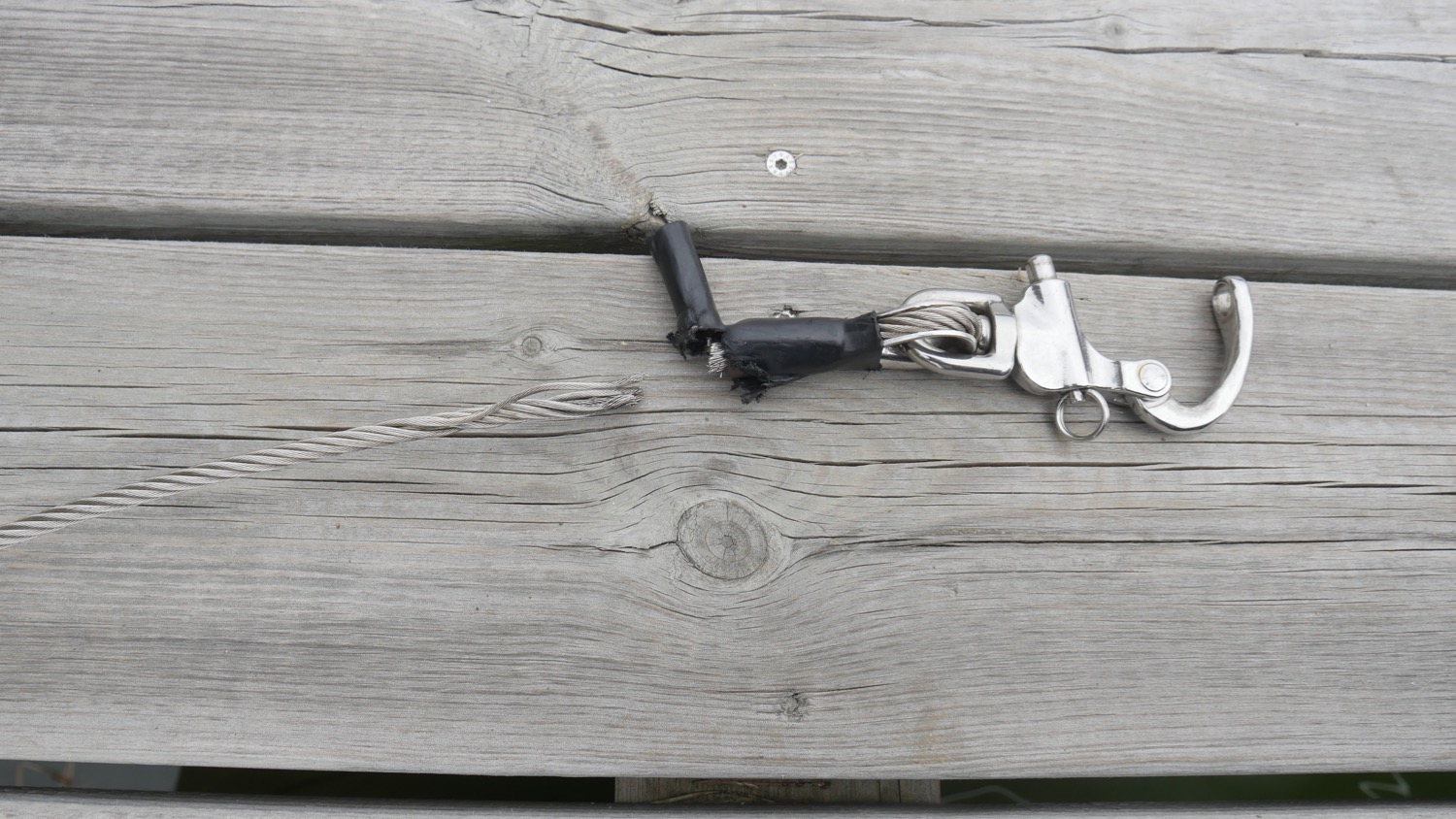The broken fore sail halyard. The reason was probably that the fore sail is already a bit worn out and the sail was hoisted too high and the wire terminal got bent over the block in the mast.