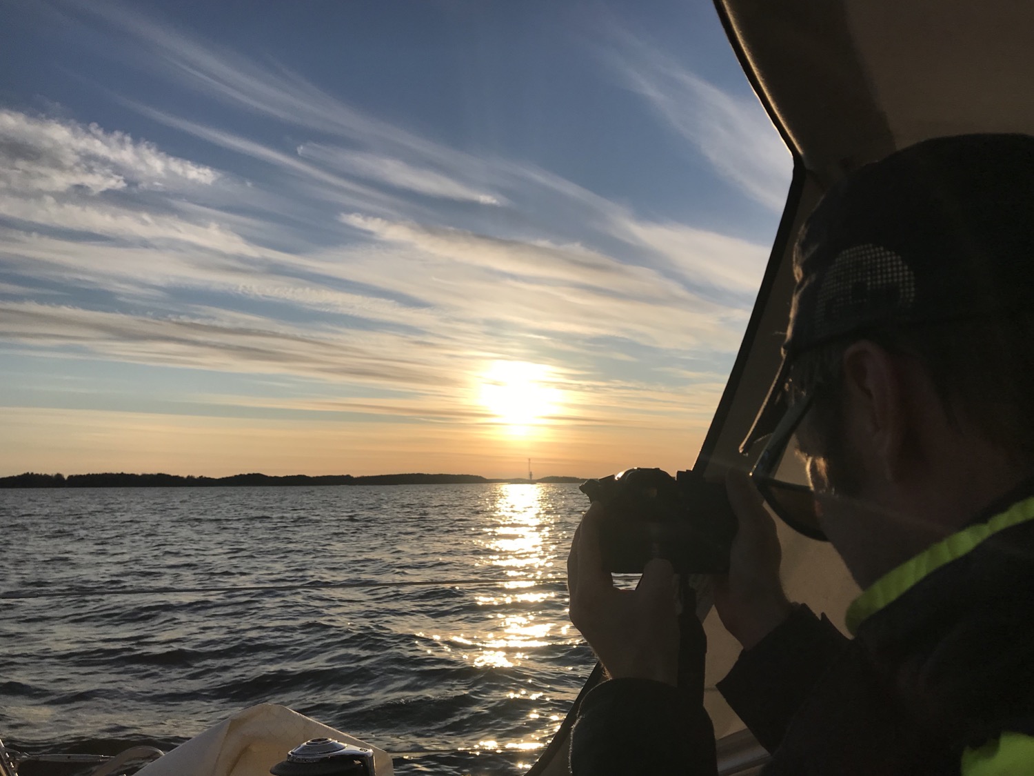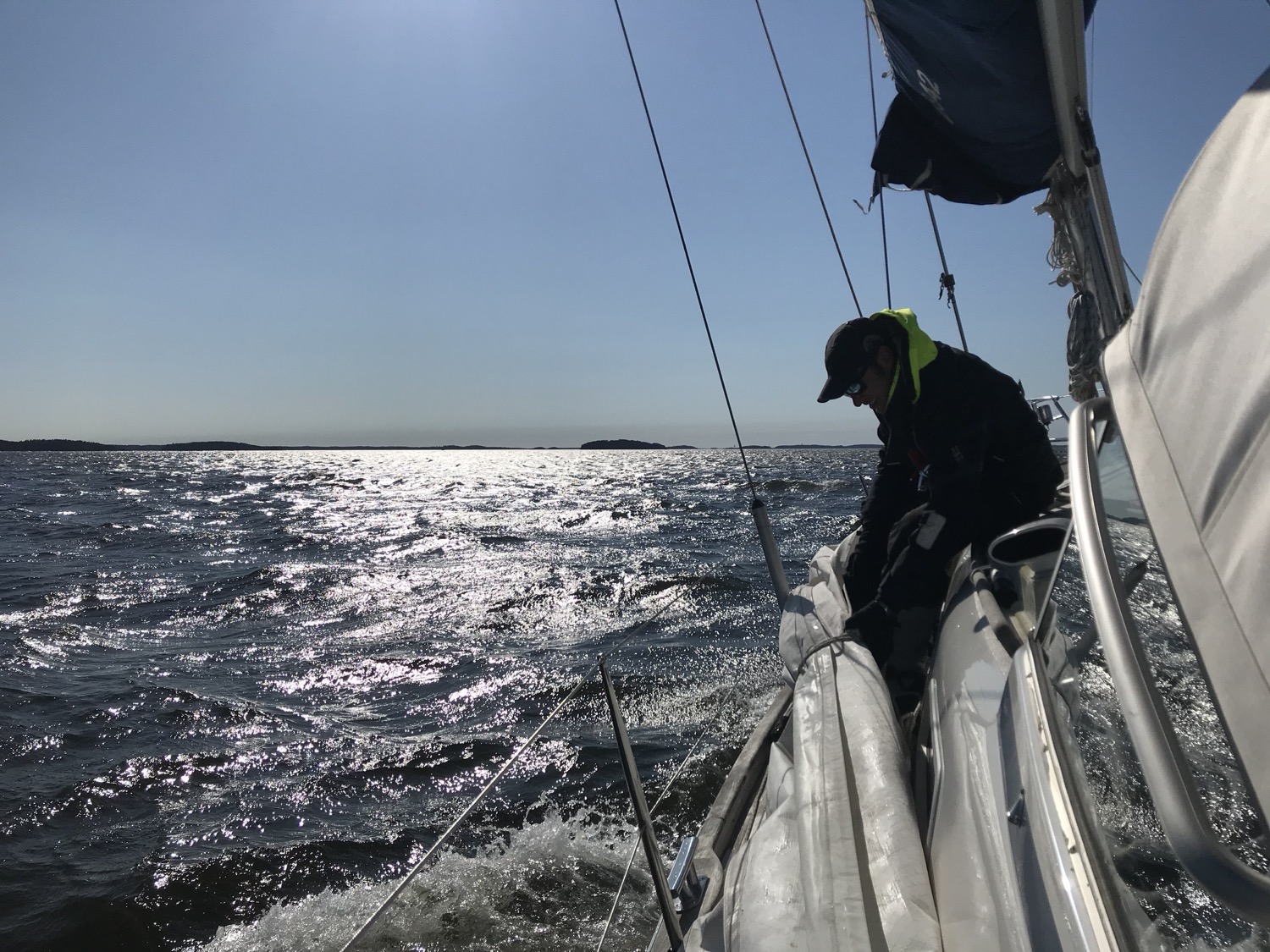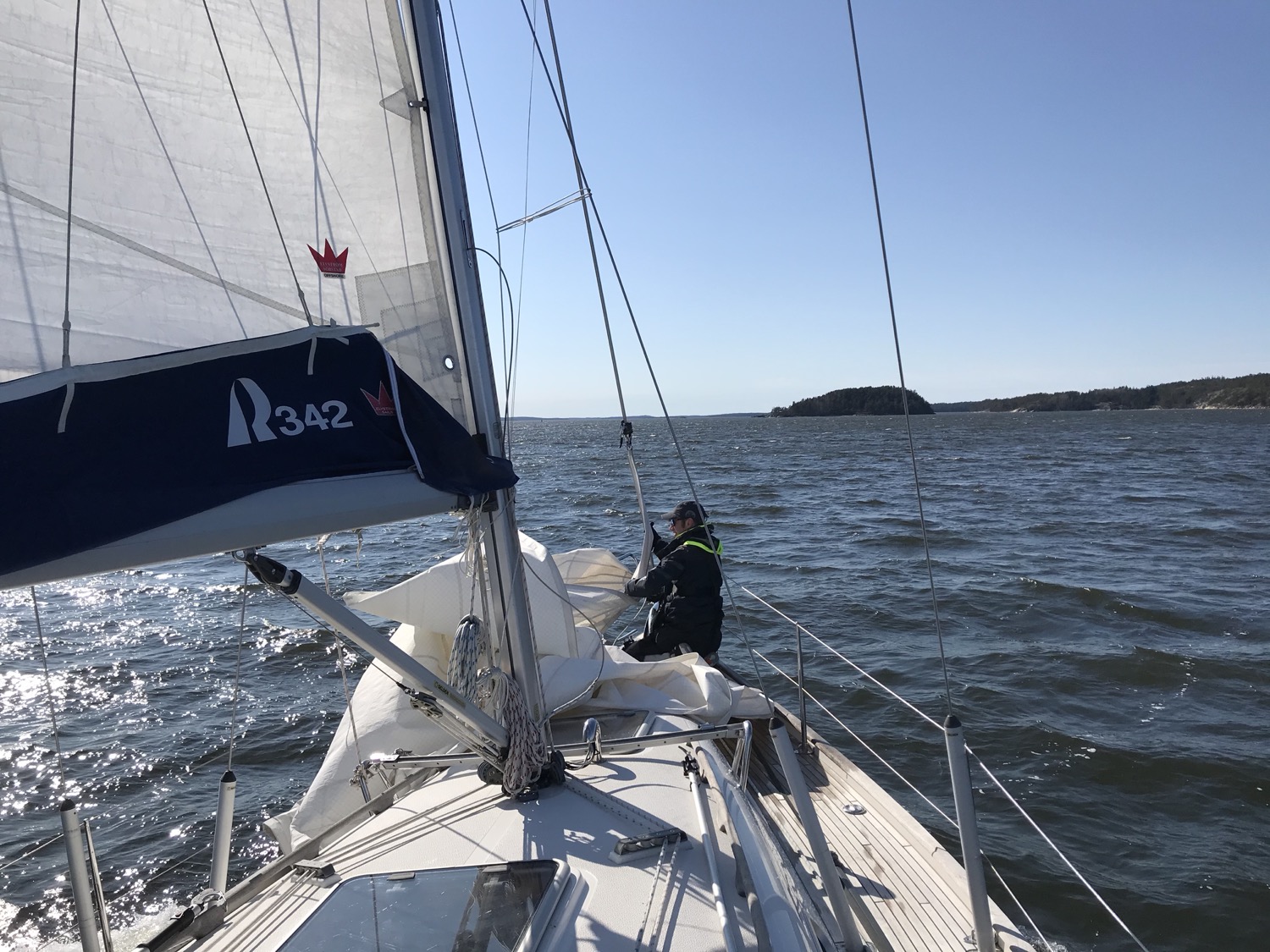 We had a minor but annoying drawback on Sunday, when sailing to windward in 10 m/s (20 kts) wind, as suddenly, the fore sail came crashing down. The jib halyard (wire) had snapped from the terminal, but fortunately the jib stayed intact. The halyard had also escaped from the top of the mast so it couldn’t be fixed underway and thus, we could only use the main sail for the remaining of the trip.
