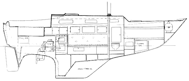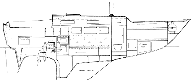 Settees in the saloon are wide and very comfortable when the backrest is raised. They make also excellent seaberths right in the center of the boat. The double V-bed in the forepeak is also comfortable and full lenght (2m). However the bed is placed quite high due to the water tank just under the bed. Thus one must do some stretching to get into to the bed and also the headroom is quite low. The headroom in the main saloon is typical 1,80m and just enough for us. The L-shaped galley is equipped with stove/oven and 50 litres fridge. There is additional galley space behind the step (on top of the engine). However problem is that the space in the galley is flat so it may be difficult to find solid place to rest plates, mugs etc. while cooking at sea. There is good locker space in galley as there is throughout the boat.