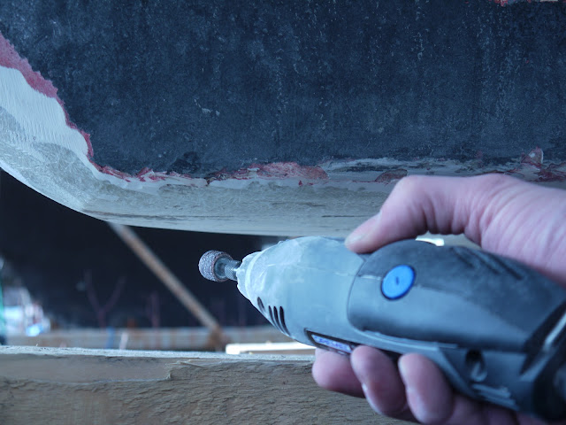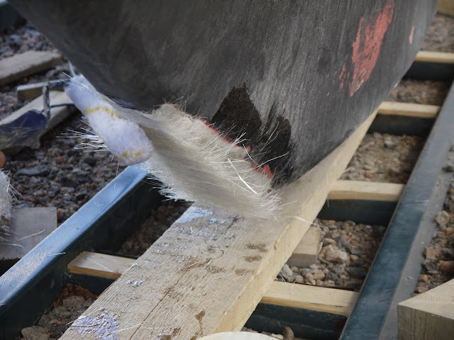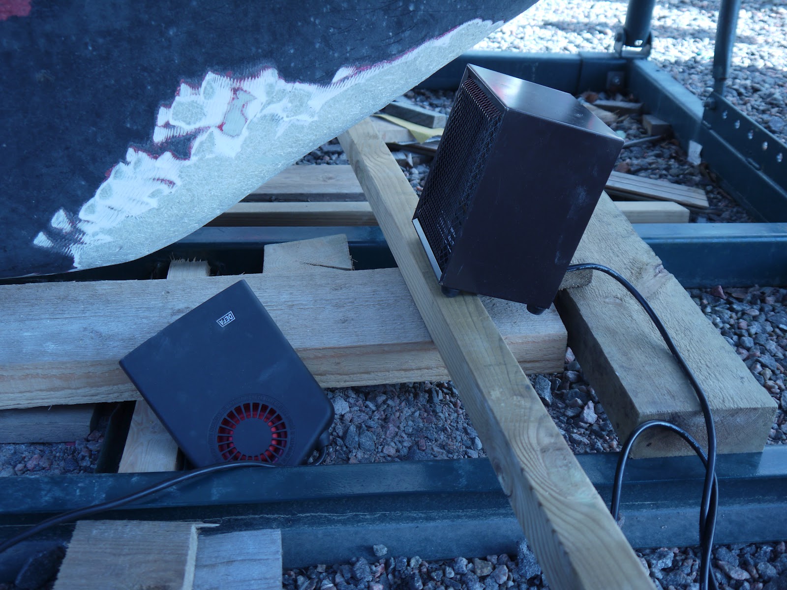 Finally we got plenty of sunshine and a bit warmer weather this weekend so it was good time to start with the keel repair. The damaged part of the leading edge of the keel was re-laminated. Also the front part of the keel bottom was repaired at the same time. However, the scratch on the bottom of the keel continues further aft so it has to be repaired in two stages. After the front part is finished, the boat is lifted up and supported on another part of the keel, so that the center of the keel bottom can be accessed.