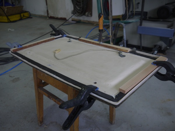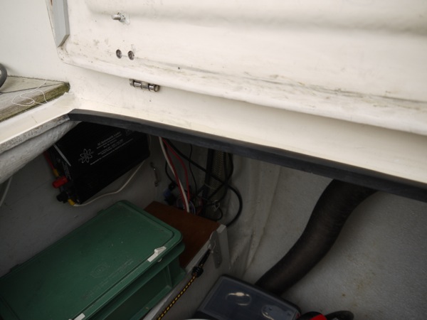 The second attempt was made in the spring 2012; we came up with a genuine solution (we thought) of glueing U-shaped seal on the locker side, so that when the lid is closed, the seal is pushed more firmly into its position. First we tried glueing the seal with Sikaflex, which made the surfaces so slippery, that it was difficult to get the seal to stay in place long enough before it started sticking. Then we tried an epoxy glue, which had a good grip, but this was not a long-term solution either, since the epoxy is not flexible. And flexibility is what is needed since the rubber is flexible. Furthermore, the U-shaped seal was too thin, so rest of the summer I was glueing those self-adhesive tapes every two weeks or so to keep the water out.