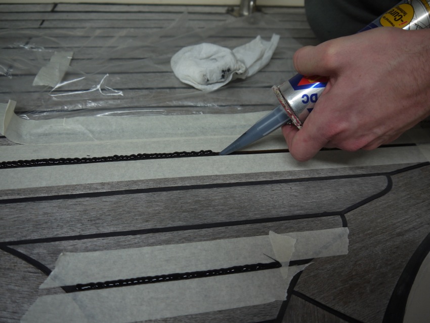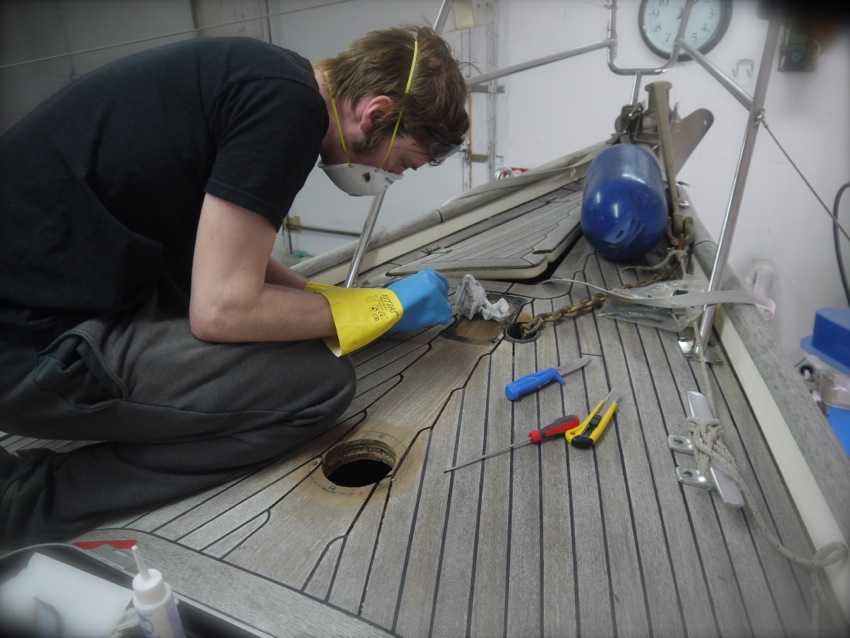 The most time-consuming part has been fixing and replacing the teak deck caulking. Basically the whole deck is now checked and all the susceptible caulking has been either removed or dealt with Capt. Tolley’s Creeping Crack Cure (See our older blog post on this). I also injected some epoxy under the teak deck to fill up empty spaces, where water could be pooling. Removing and cleaning the old caulking is incredibly time-consuming, but filling the seams is on the other hand pretty straight-forward job.