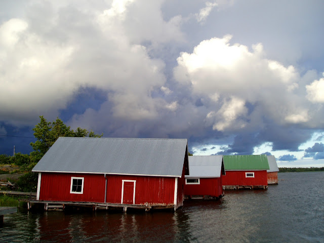 Small red boathouses and dark sky on Jurmo (north), Åland archipelago (July, 2007)