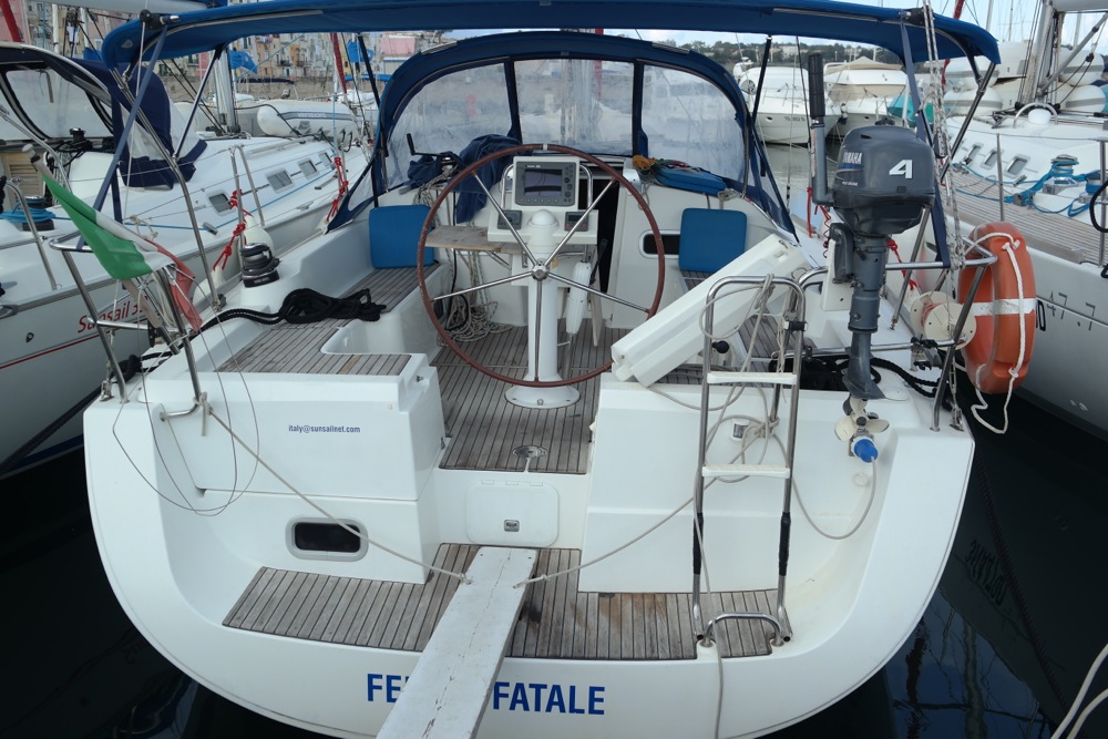 I guess that the answer to this question is yes and no. The boat was named Femme Fatale, and indeed, she definitely had some nice qualities for the relaxed sailing under the sunny skies and warm winds of the Med. All in all, that is what this boat is designed for. The large bathing platform, a huge cockpit protected by a large bimini, large foldable cockpit table, a simple rig and large galley all made the life very comfortable onboard. Stepping on to the boat was very easy from the open stern and the cockpit shower was great after a swim in the salty Mediterranean.