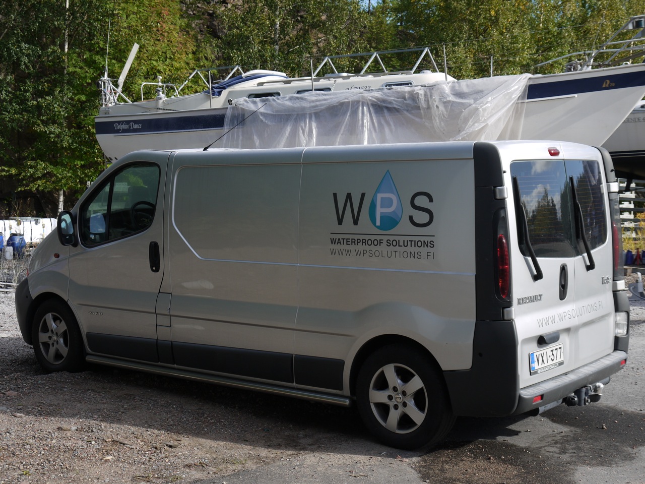 We decided to have the underwater hull blasted right after Dolphin Dance was hoisted out of the water. New barrier coat and antifouling will be applied in the spring. For removing the old bottom paint, we opted soda blasting, which I consider the most advanced and environmentally friendly hull cleaning method. It is gentle for the gelcoat surface compared to sandblasting where a lot of gelcoat is potentially lost. In soda blasting, basically a normal baking (or cooking) soda is sprayed against surface using compressed air. Soda is a natural and water-soluble product, so the residues can be rinsed with water.