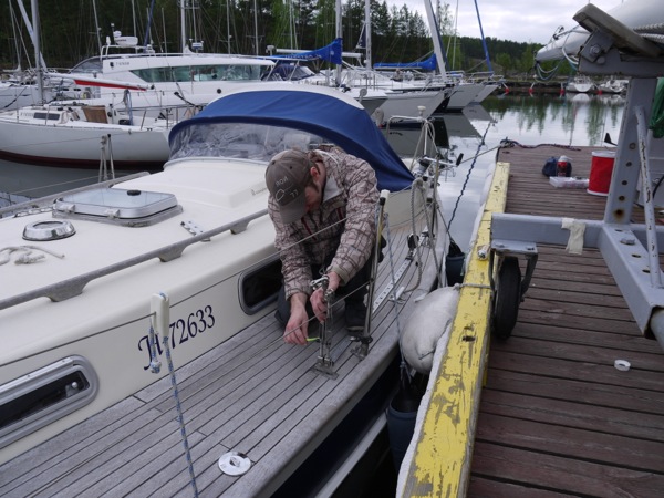 We launched finally on Thursday and the mast was stepped on Friday. It is interesting when we have spent a lot of time during the winter to fix things at the boat, but still the last hour before the scheduled launch was so hectic to get everything done. I guess that it is another law of boating: the boat is ‘ready’ when the tractor/crane arrives…