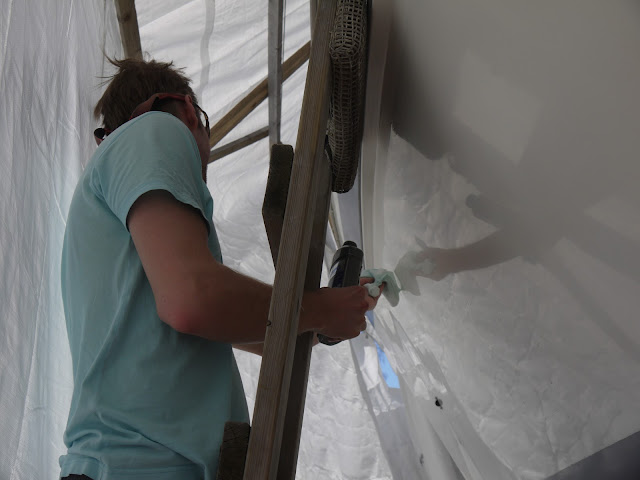 On Monday we started, among other things, waxing the topsides of s/y Dolphin Dance and 3/4 of the work is done now. As mentioned earlier, the keel repair is the deciding factor for our launch schedule, but we try to make the boat as ready as we can regarding other respects. If we have spare time before the launch, we will do a second round of waxing, but the topsides look pretty good just after the first round. The topsides were first washed with plenty of water and boat shampoo, then treated with Hempel’s Cleaning Powder and finally waxed. Addition to that, the bootstripe and area right above the waterline was treated with Hempel’s Clean & Polish to get rid of the the algae and waterline stain.