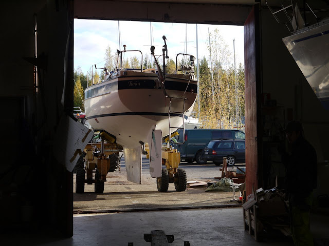 This morning Dolphin Dance was moved from yard to a boat shed, where she will be spending the coming winter. So everything is now about ready for the winter refit/renovation. First on the to-do-list is polishing and waxing the topsides and coachroof, which I will probably start doing next week. The actual renovation plan is however still to be done, but I will keep you updated after we have had time to go through the boat and make the plan with Airisto Marine, that is the company doing the renovation.